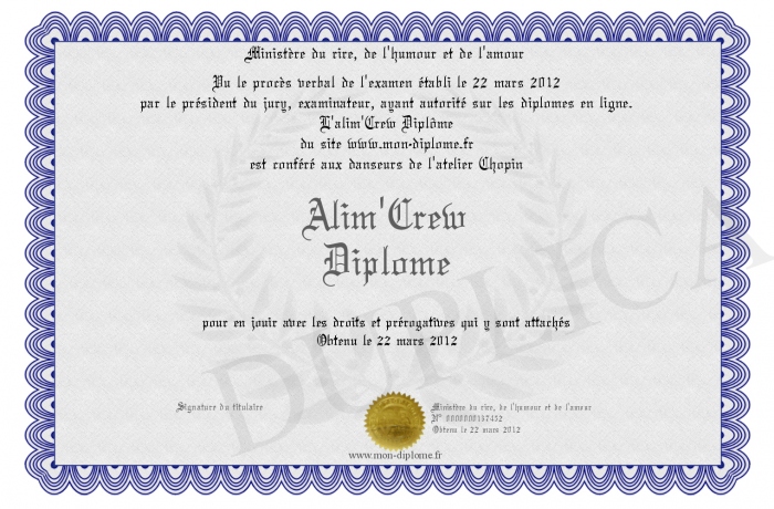 Envoyez par email votre Alim'Crew Diplôme personalisé