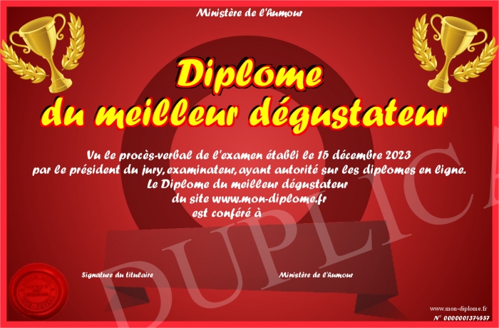 Envoyez par email votre Diplôme du meilleur dégustateur personalisé