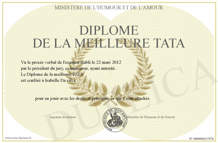 Envoyez par email votre Diplome de la meilleure TATA personalisé