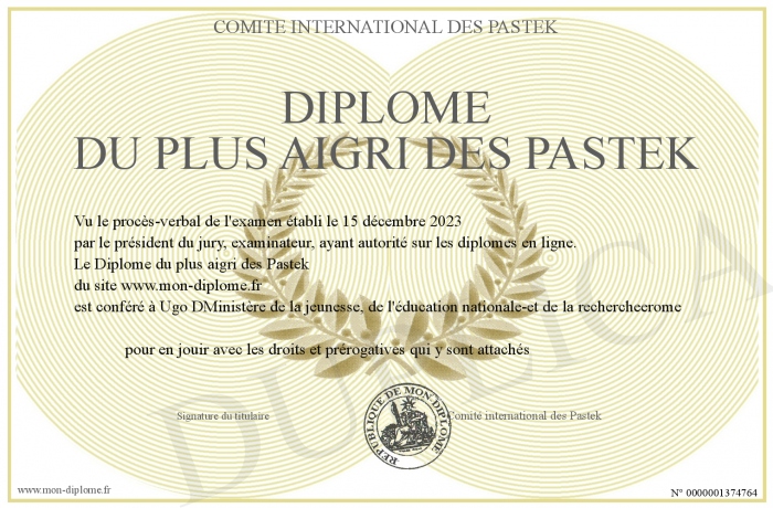 Envoyez par email votre Diplôme du plus aigri des Pastek personalisé