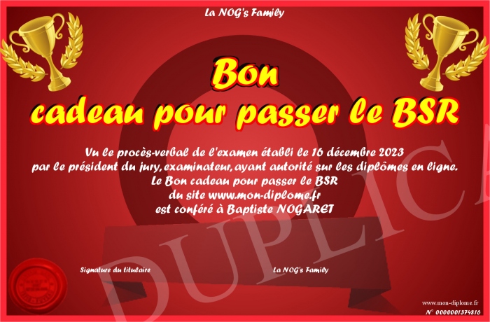 Envoyez par email votre Bon cadeau pour passer le BSR personalisé