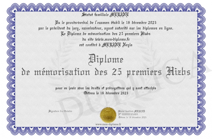 Envoyez par email votre Diplôme de mémorisation des 25 premiers Hizbs personalisé