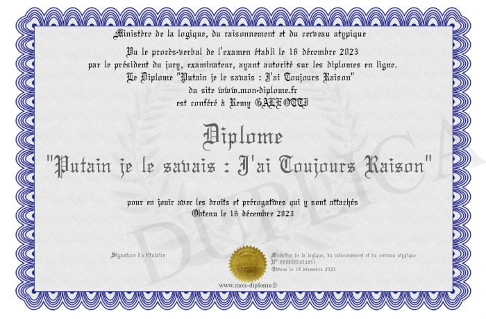 Envoyez par email votre Diplôme -Putain je le savais : J'ai Toujours Raison- personalisé