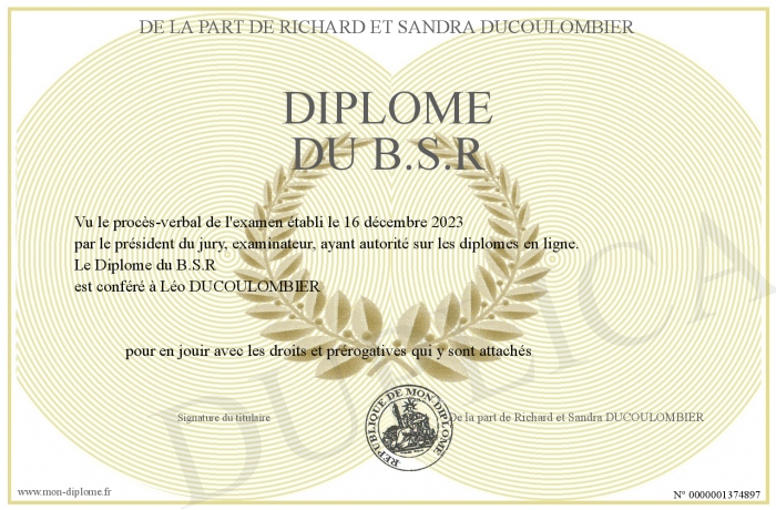 Envoyez par email votre Diplôme du B.S.R personalisé