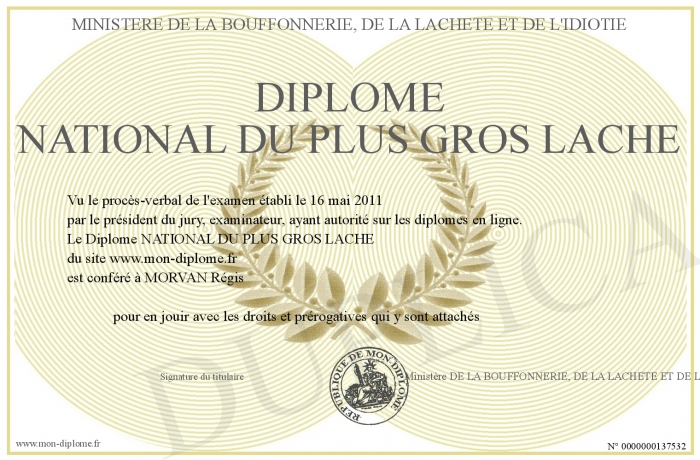 Envoyez par email votre Diplôme NATIONAL DU PLUS GROS LACHE personalisé