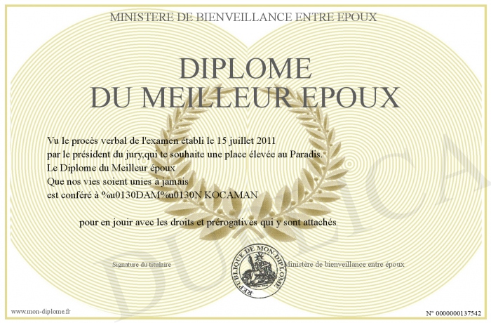 Envoyez par email votre Diplôme du Meilleur époux personalisé