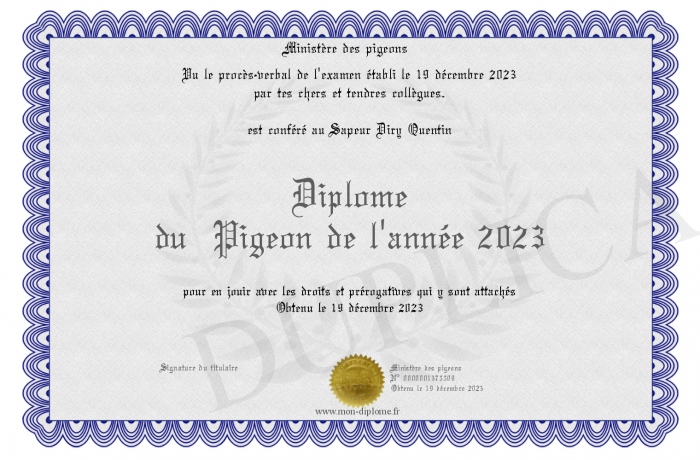 Envoyez par email votre Diplôme du Pigeon de l'année 2023 personalisé