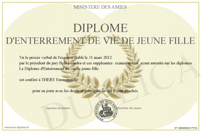 Envoyez par email votre Diplome d'Enterrement de vie de jeune fille personalisé