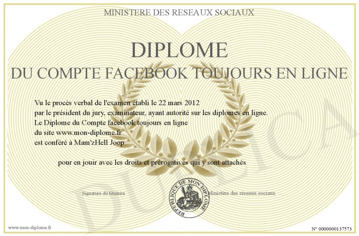 Envoyez par email votre Diplôme du Compte facebook toujours en ligne personalisé