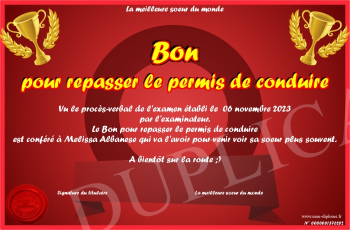 Envoyez par email votre Bon pour repasser le permis de conduire personalisé
