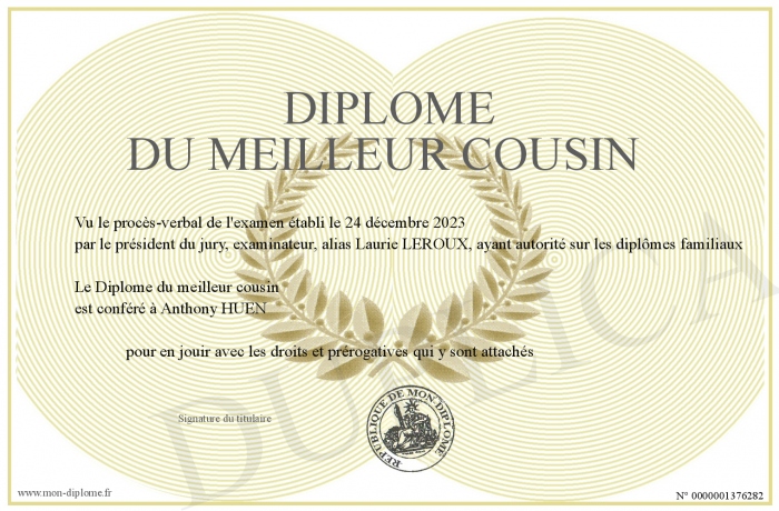 Envoyez par email votre Diplôme du meilleur cousin personalisé
