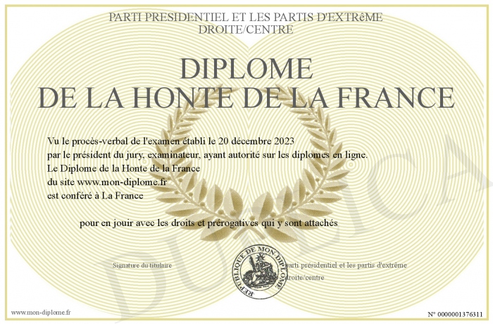 Envoyez par email votre Diplome de la Honte de la France personalisé
