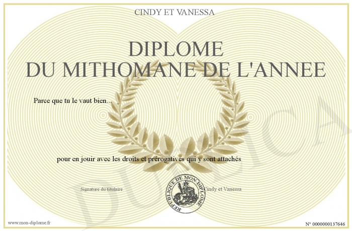 Envoyez par email votre Diplôme du mithomane de l'année personalisé