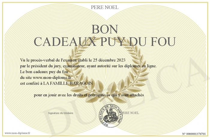 Envoyez par email votre bon cadeaux puy du fou personalisé