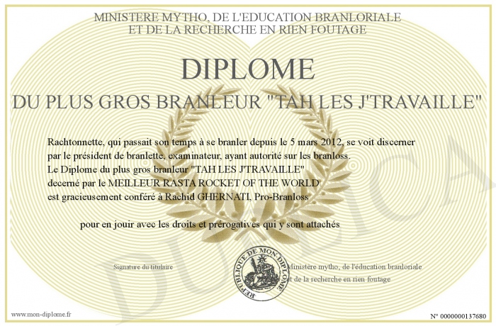 Envoyez par email votre Diplôme du plus gros branleur -TAH LES J'TRAVAILLE- personalisé