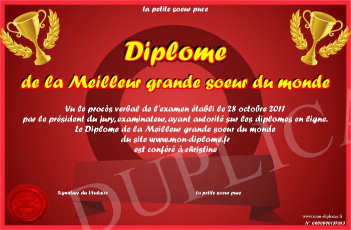 Envoyez par email votre Diplome de la Meilleur grande soeur du monde personalisé