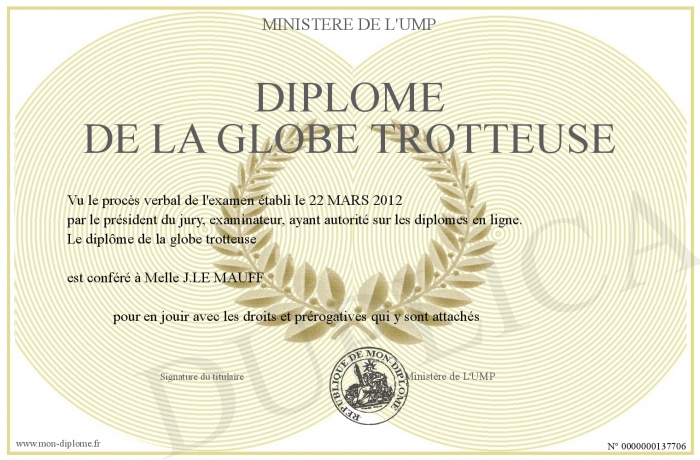 Envoyez par email votre DIPLOME DE LA GLOBE TROTTEUSE personalisé