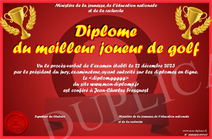 Envoyez par email votre Diplôme du meilleur joueur de golf personalisé