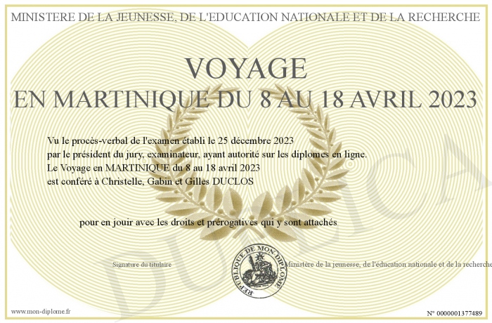 Envoyez par email votre Voyage en MARTINIQUE du 8 au 18 avril 2023 personalisé