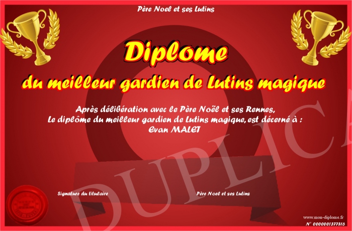 Envoyez par email votre Diplôme du meilleur gardien de Lutins magique personalisé