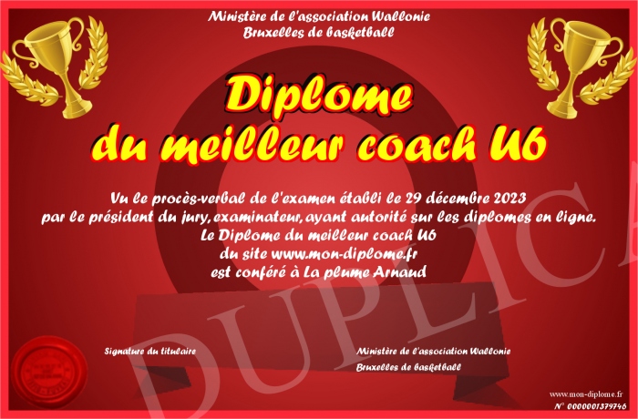 Envoyez par email votre Diplôme du meilleur coach U6 personalisé