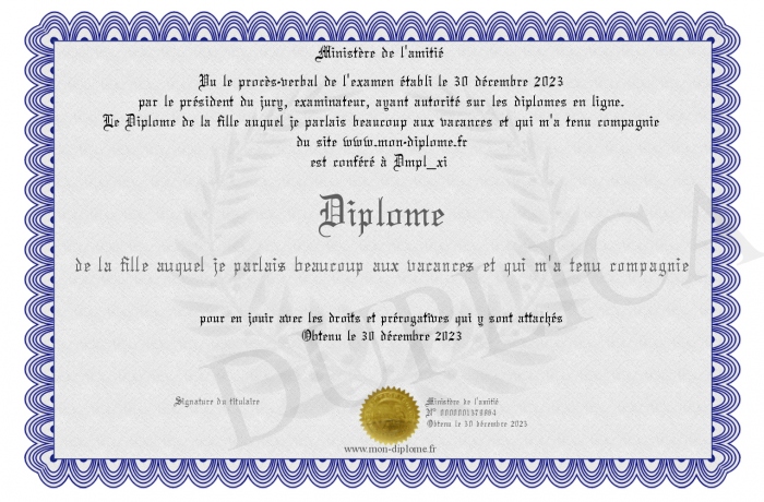 Envoyez par email votre Diplôme de la fille auquel je parlais beaucoup aux vacances et qui m'a tenu compagnie personalisé
