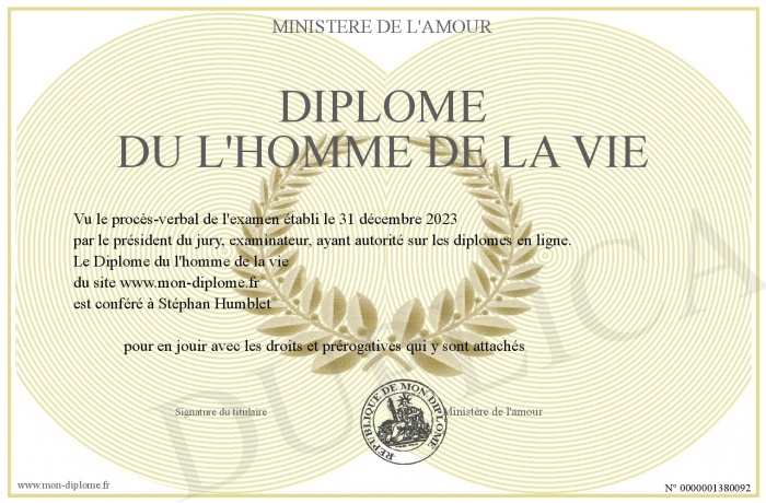 Envoyez par email votre Diplôme du l'homme de la vie personalisé