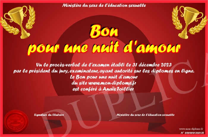 Envoyez par email votre Bon pour une nuit d'amour personalisé