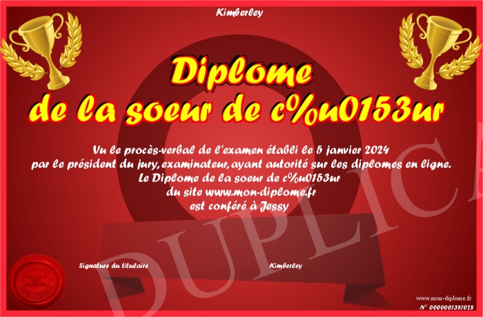 Envoyez par email votre Diplôme de la soeur de coeur personalisé