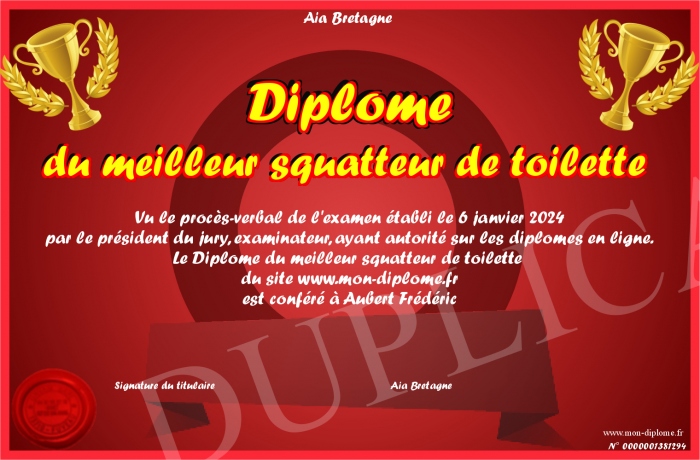 Envoyez par email votre Diplôme du meilleur squatteur de toilette personalisé
