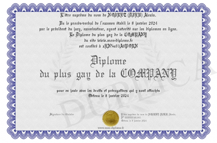 Envoyez par email votre Diplôme du plus gay de la COMPANY personalisé