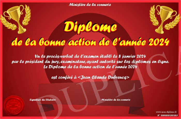 Envoyez par email votre Diplôme de la bonne action de l'année 2024 personalisé