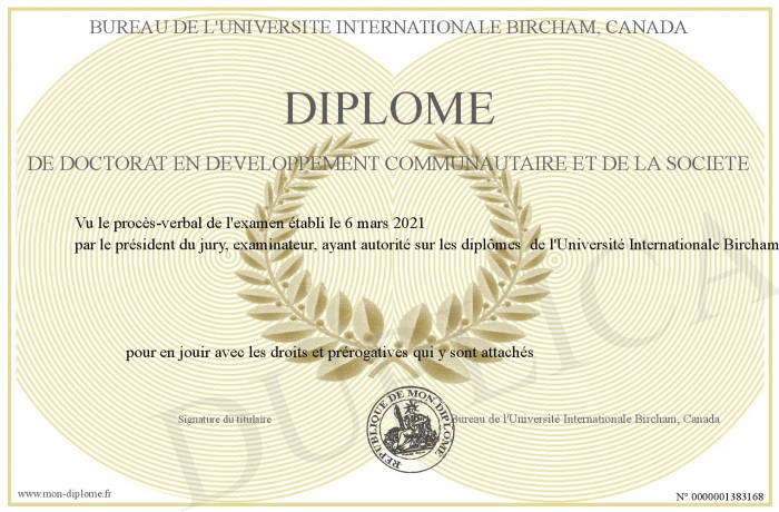 Envoyez par email votre Diplôme de Doctorat en Développement Communautaire et de la Société personalisé