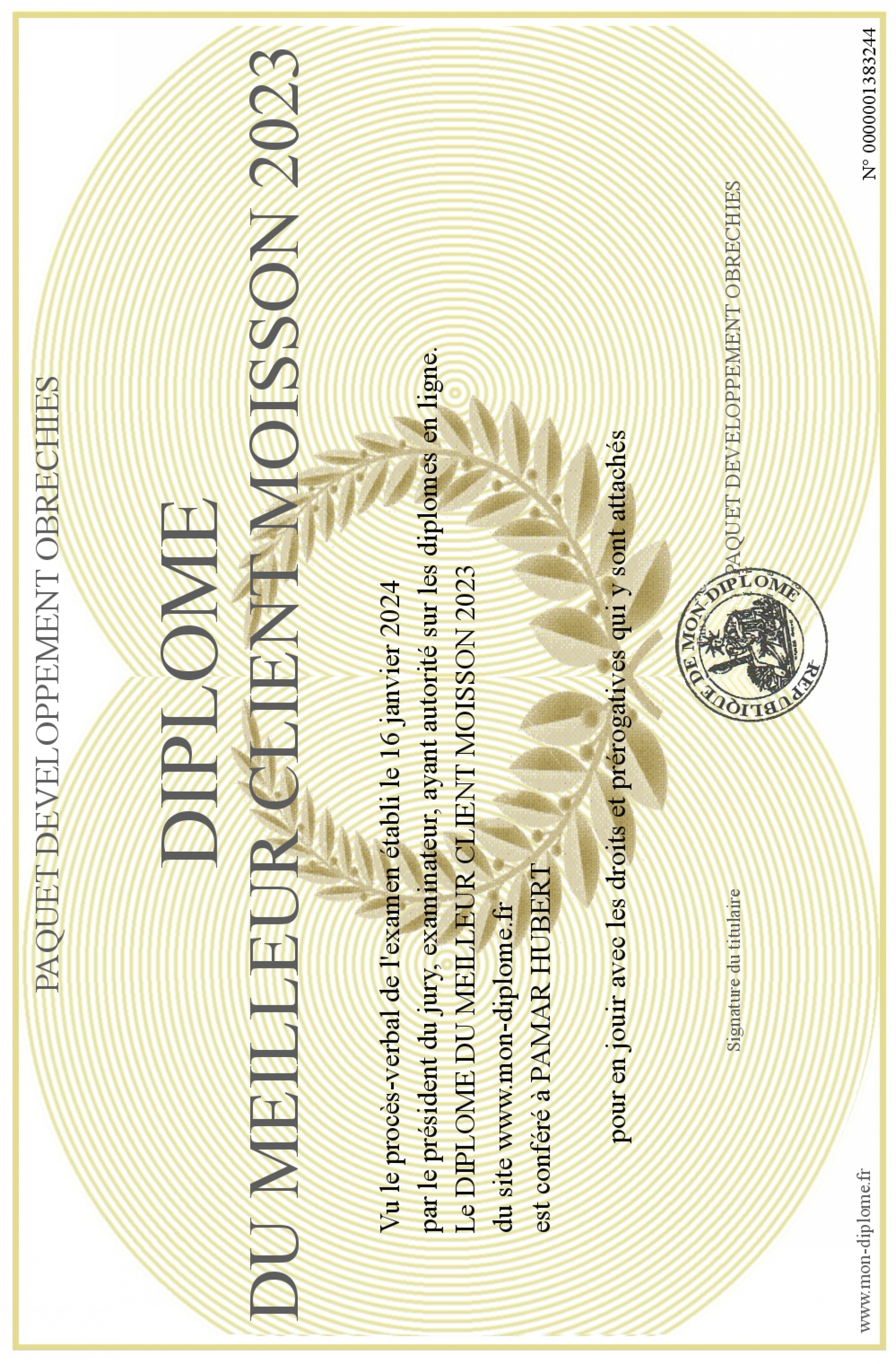 Envoyez par email votre DIPLOME DU MEILLEUR CLIENT MOISSON 2023 personalisé