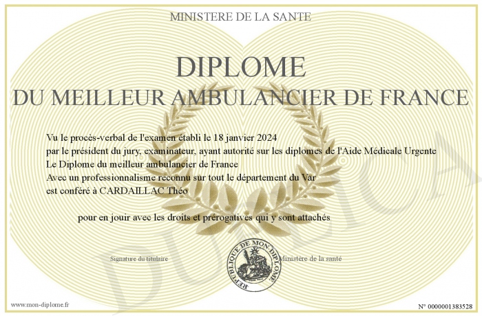 Envoyez par email votre Diplôme du meilleur ambulancier de France personalisé