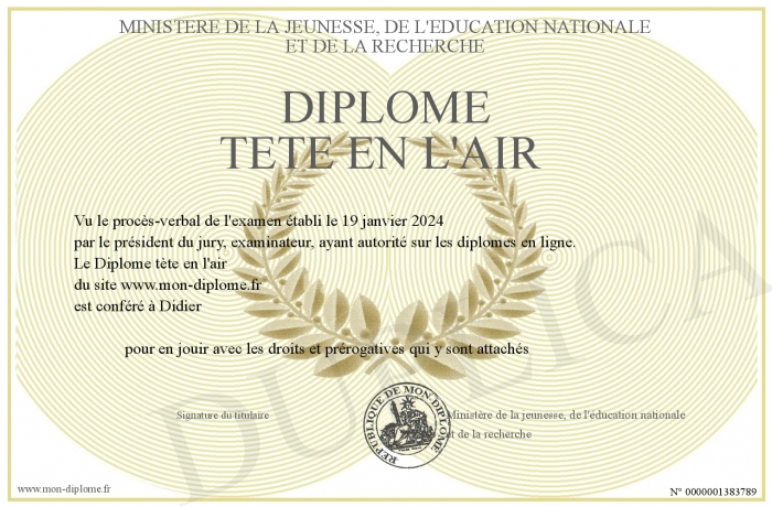Envoyez par email votre Diplôme tète en l'air personalisé