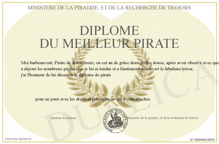 Envoyez par email votre Diplôme du meilleur pirate personalisé