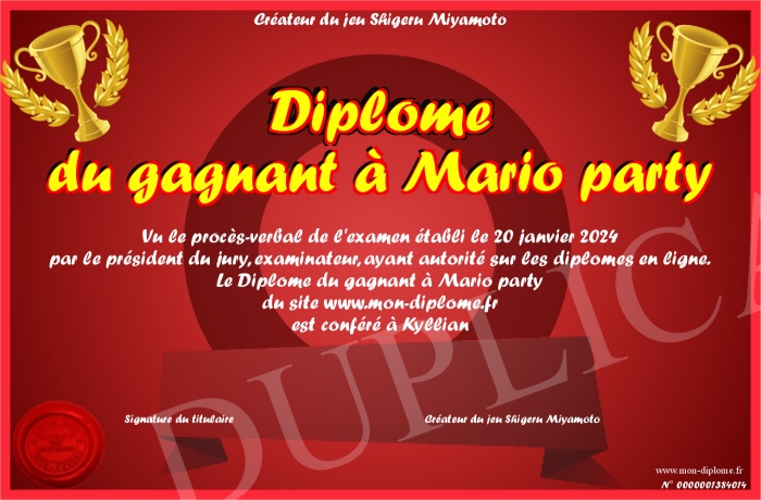 Envoyez par email votre Diplôme du gagnant à Mario party personalisé