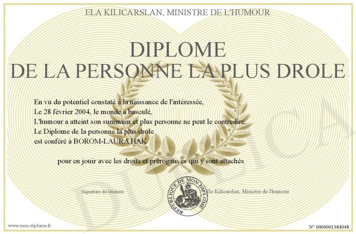 Envoyez par email votre Diplôme de la personne la plus drole personalisé