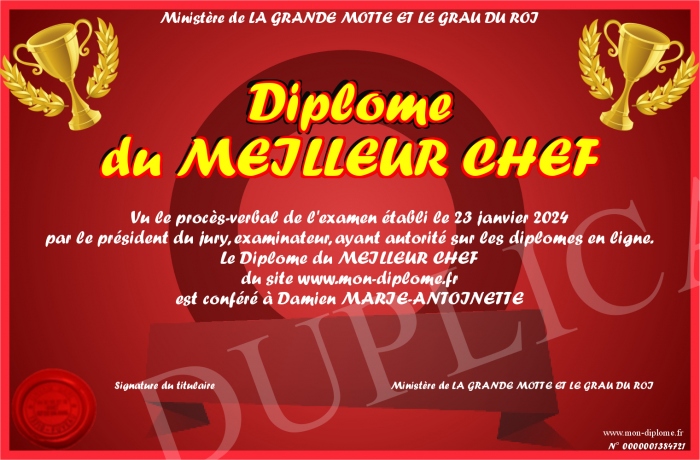 Envoyez par email votre Diplôme du MEILLEUR CHEF personalisé