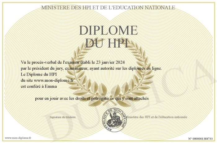 Envoyez par email votre Diplôme du HPI personalisé