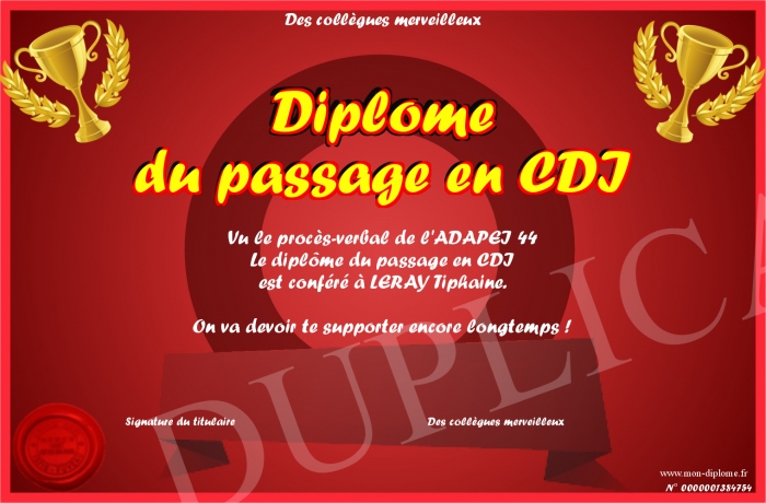 Envoyez par email votre Diplôme du passage en CDI personalisé