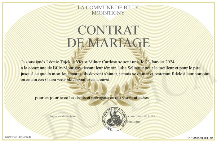 Envoyez par email votre CONTRAT DE MARIAGE personalisé