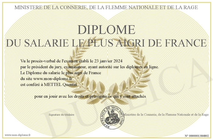 Envoyez par email votre Diplôme du salarie le plus aigri de France personalisé