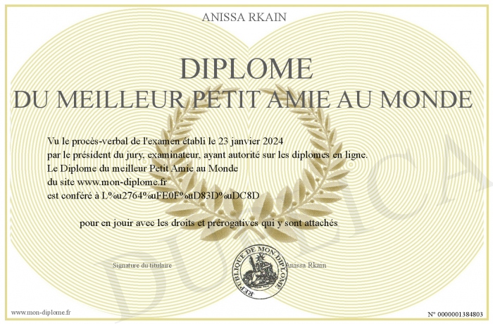 Envoyez par email votre Diplôme du meilleur Petit Amie au Monde personalisé