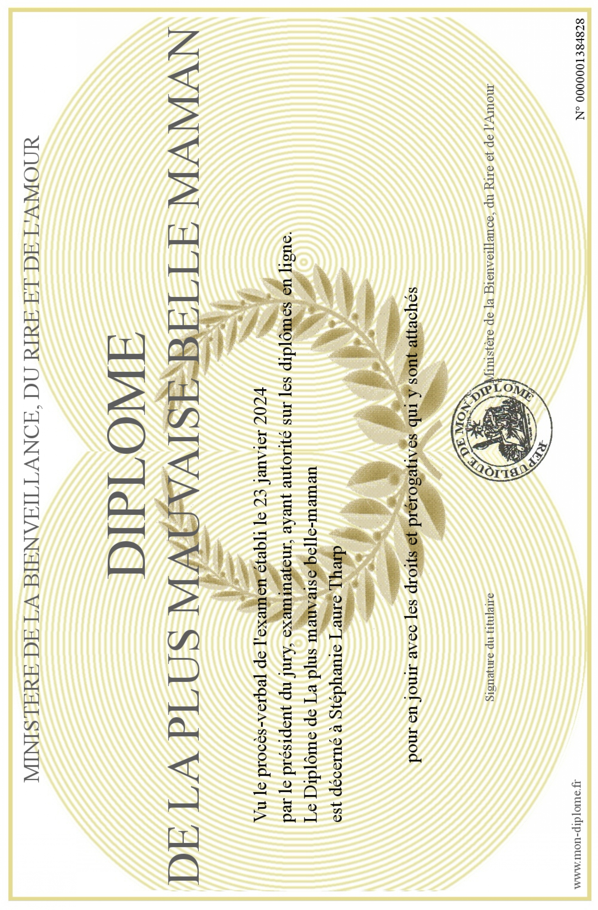Envoyez par email votre Diplôme de la plus mauvaise belle maman personalisé