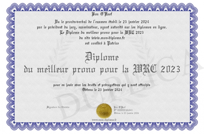 Envoyez par email votre Diplôme du meilleur prono pour la WRC 2023 personalisé