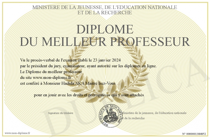 Envoyez par email votre Diplôme du meilleur professeur personalisé