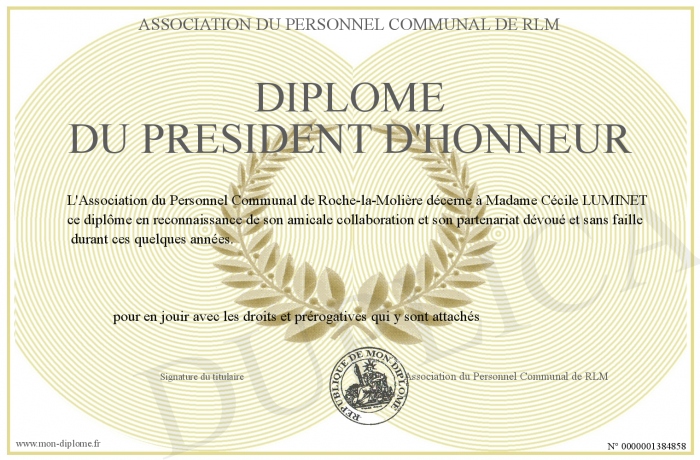 Envoyez par email votre Diplôme du Président d'honneur personalisé
