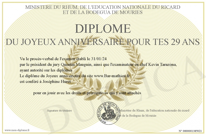 Envoyez par email votre Diplôme du Joyeux anniversaire pour tes 29 ans personalisé